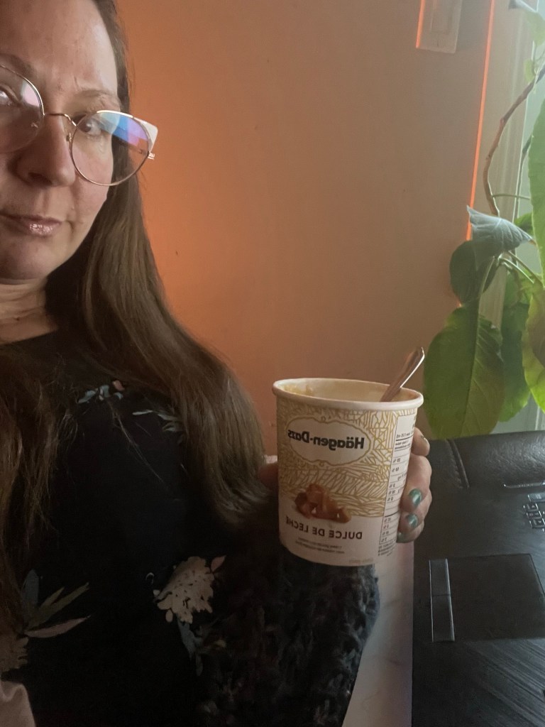 But for all the problems of others that I know an answer for, I don’t know how to solve this. What I do know, is I have to be okay with not knowing this solution. I allow myself to be lazy, not top par, photograph in the dark eating ice cream and not retake ten times until I like where my belly sits behind my laptop.