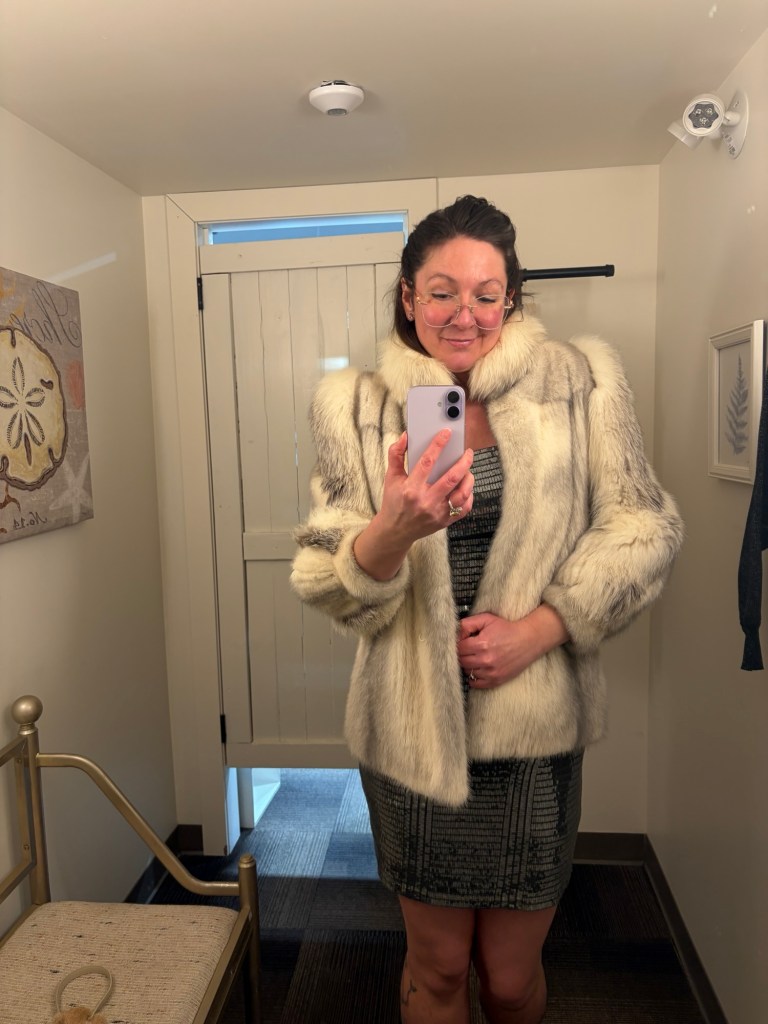 PS this is me thrifting and trying to decide if I should buy a $300 mink fur jacket with sleeves way too short for my Amazonian ass